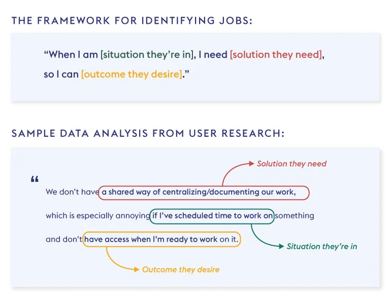 Then, I analyzed the data in the Jobs-to-be-Done framework. This led me to identify the top business and user needs and to create a pool of solutions.